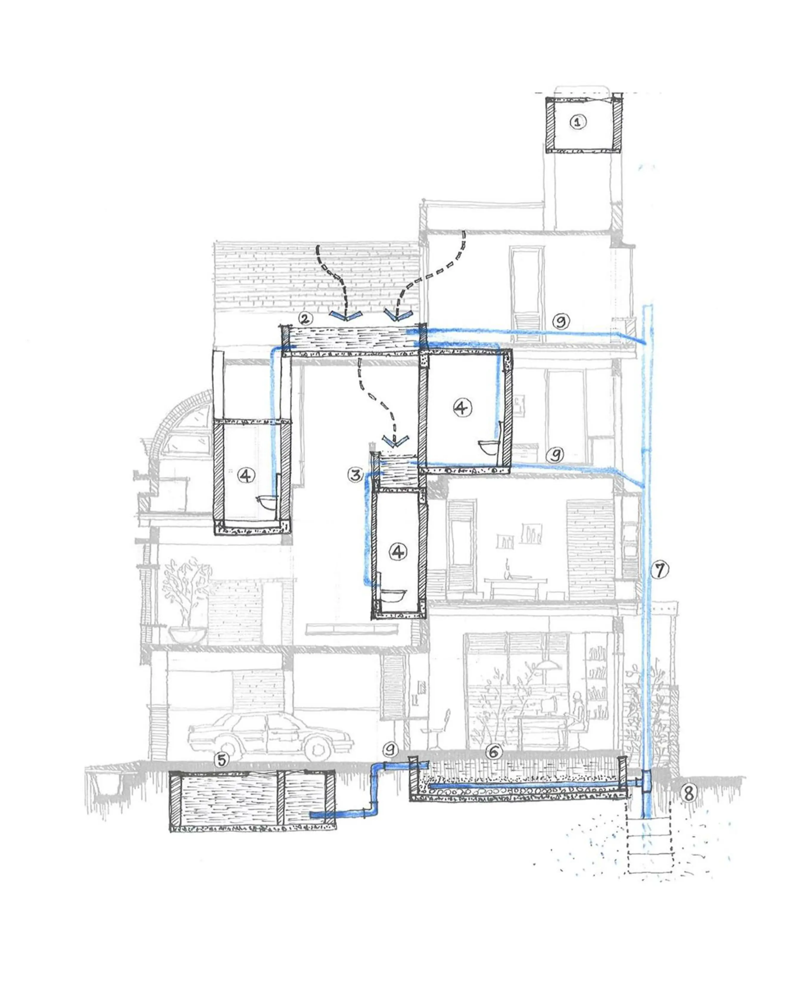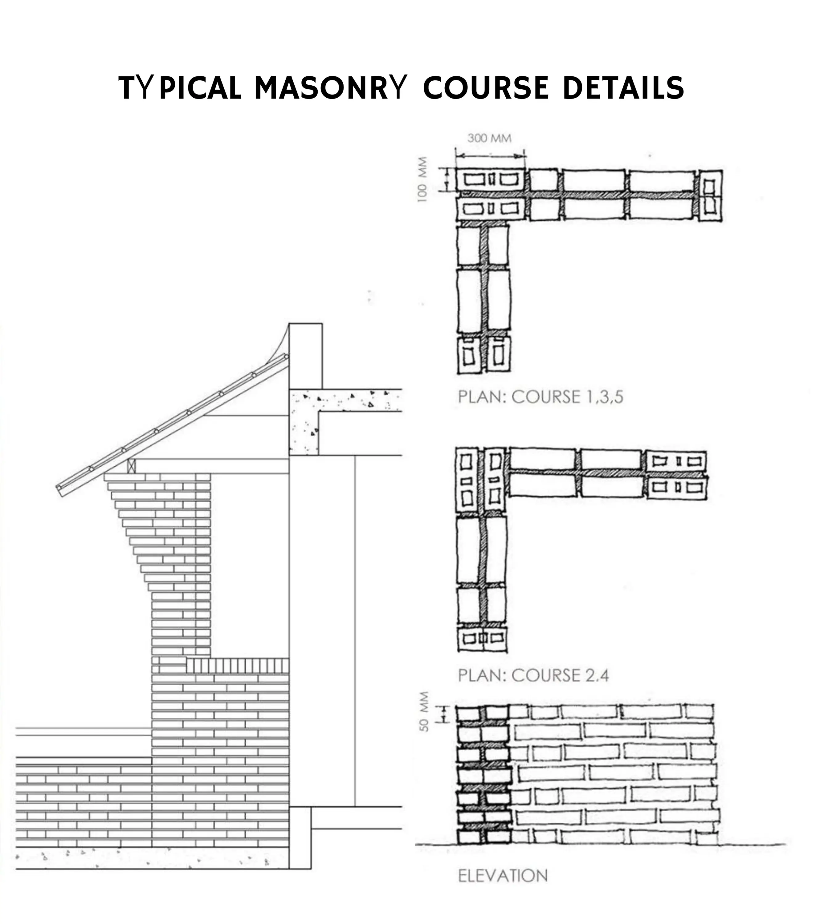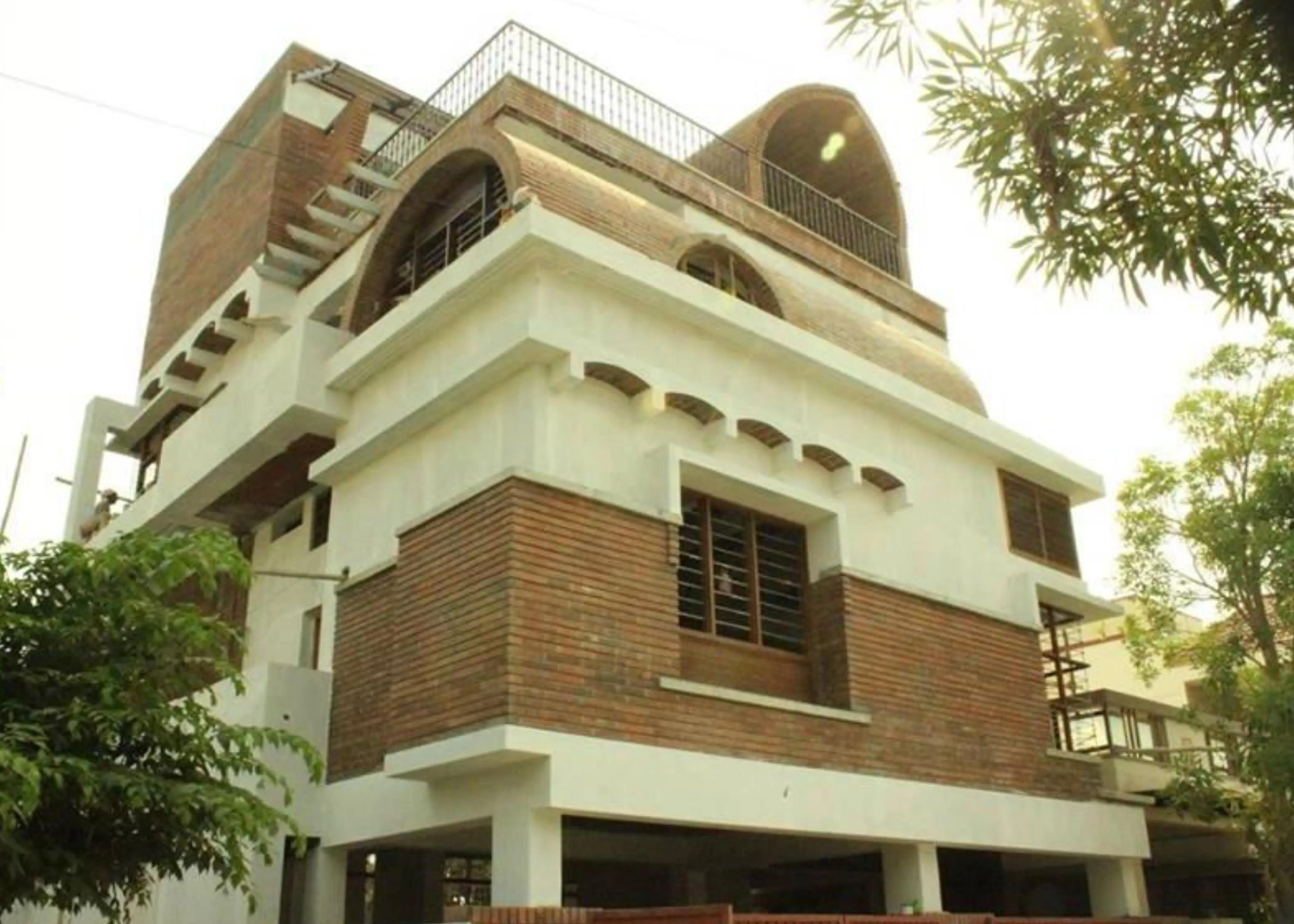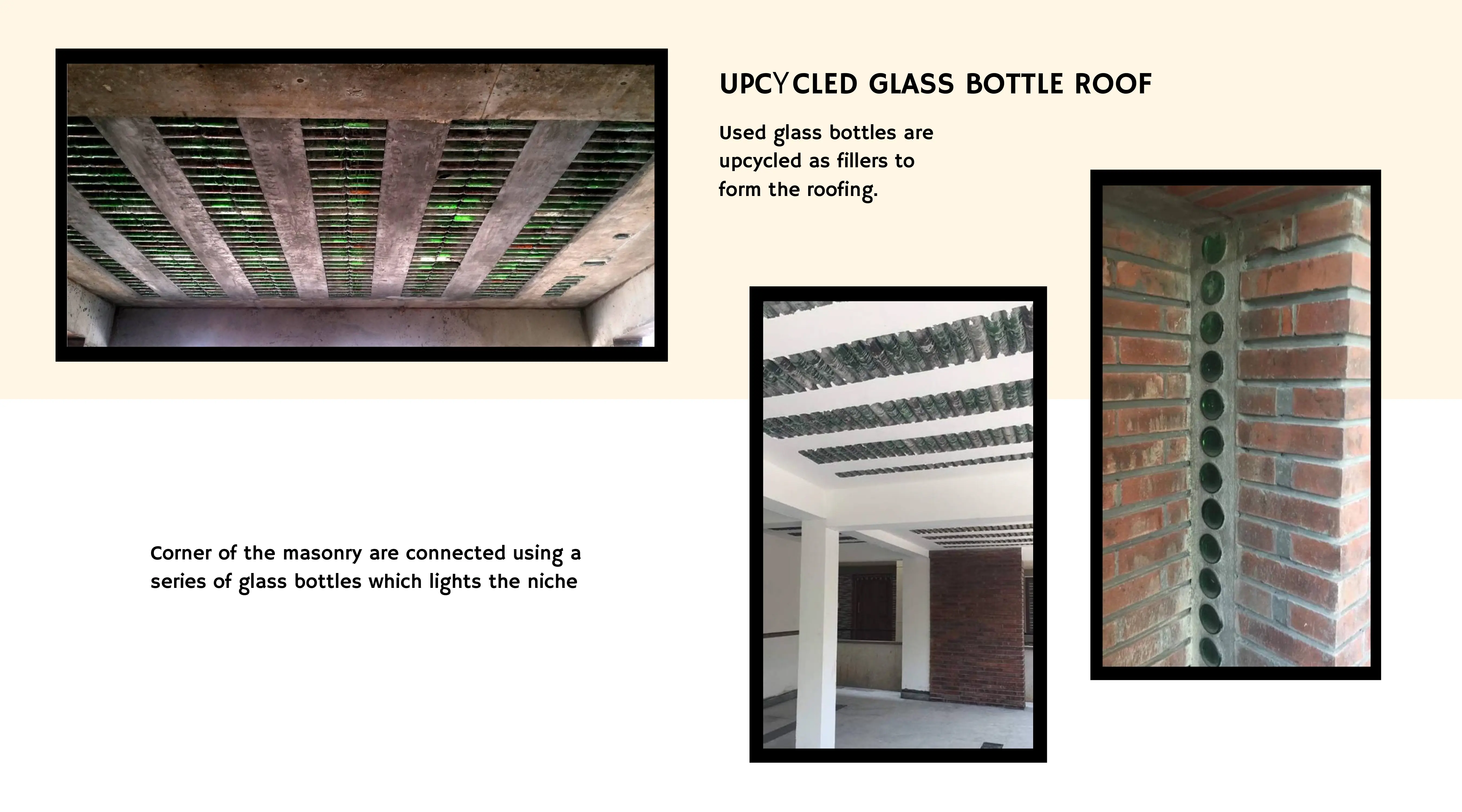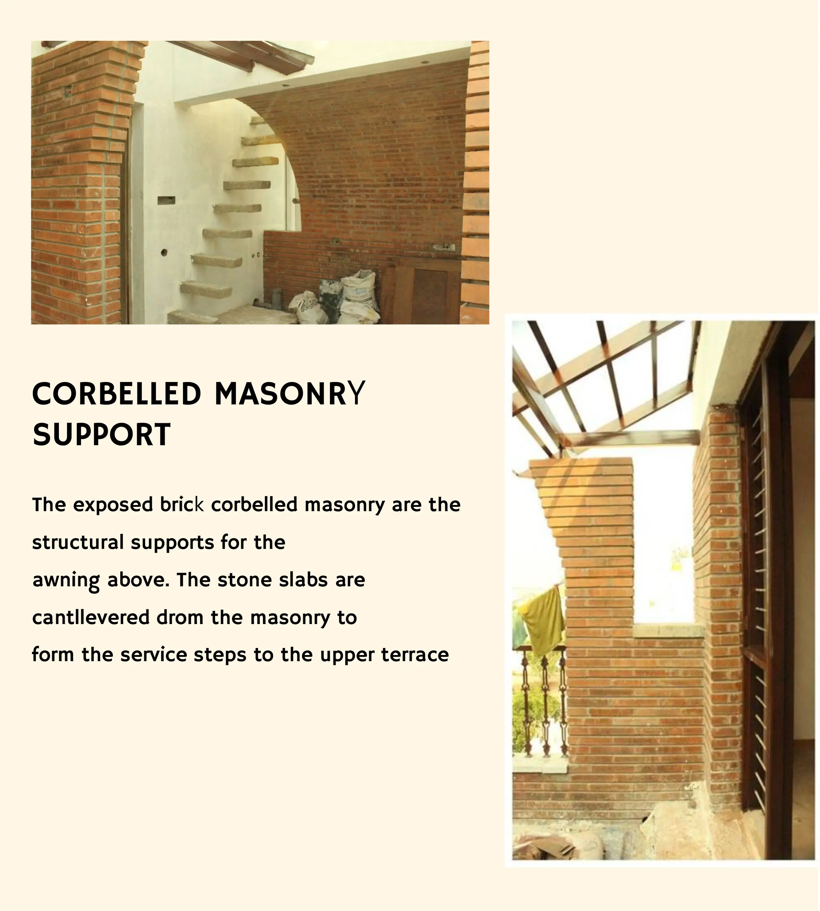 The elements of design viz. brick vaulted roof, arch panelled roof, sunshades, rainwater gutters, sill and lintel band projections, interior niches brought about articulation of the interior spaces while also creating an interesting silhoutte and a punctuated external facade.
